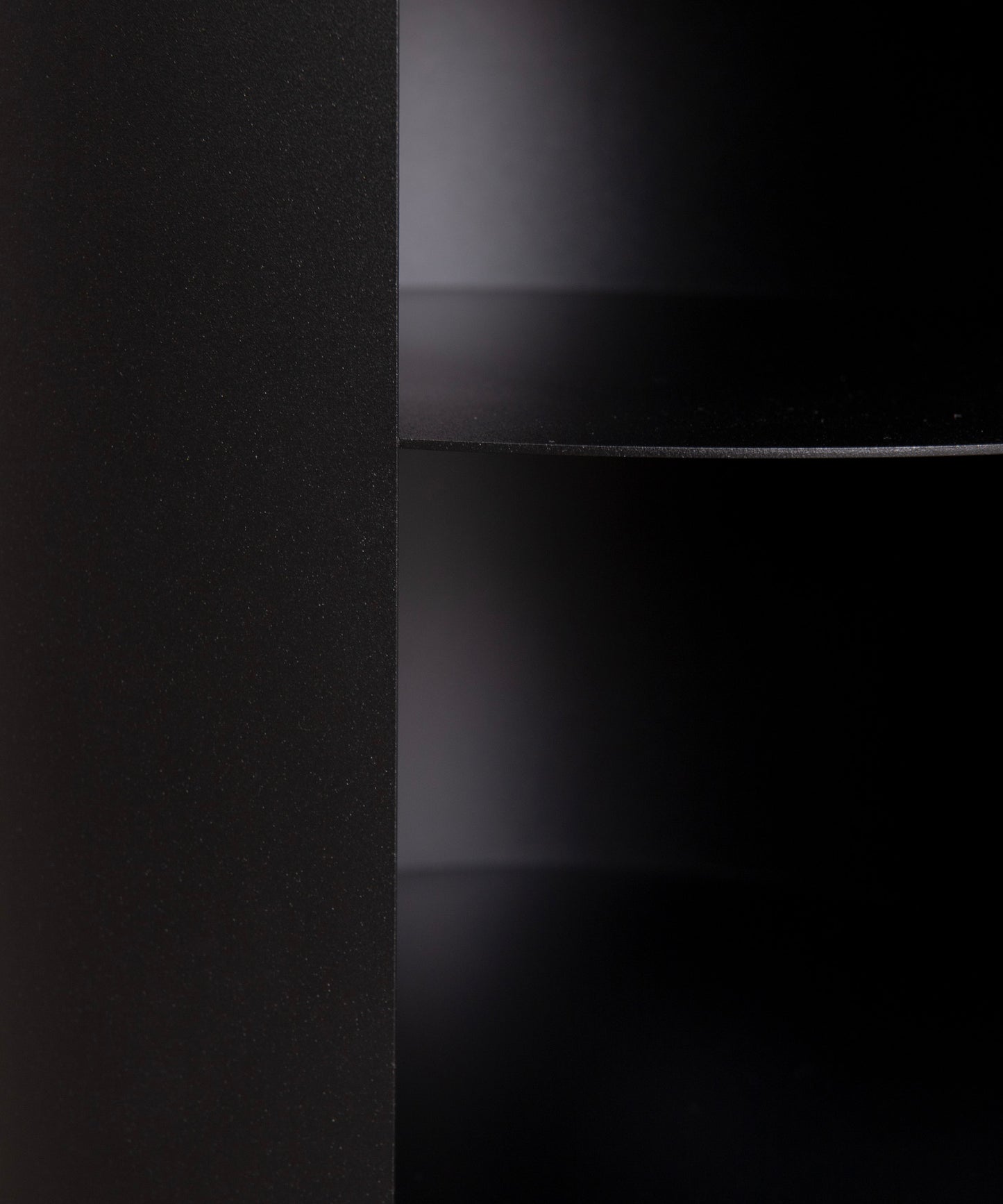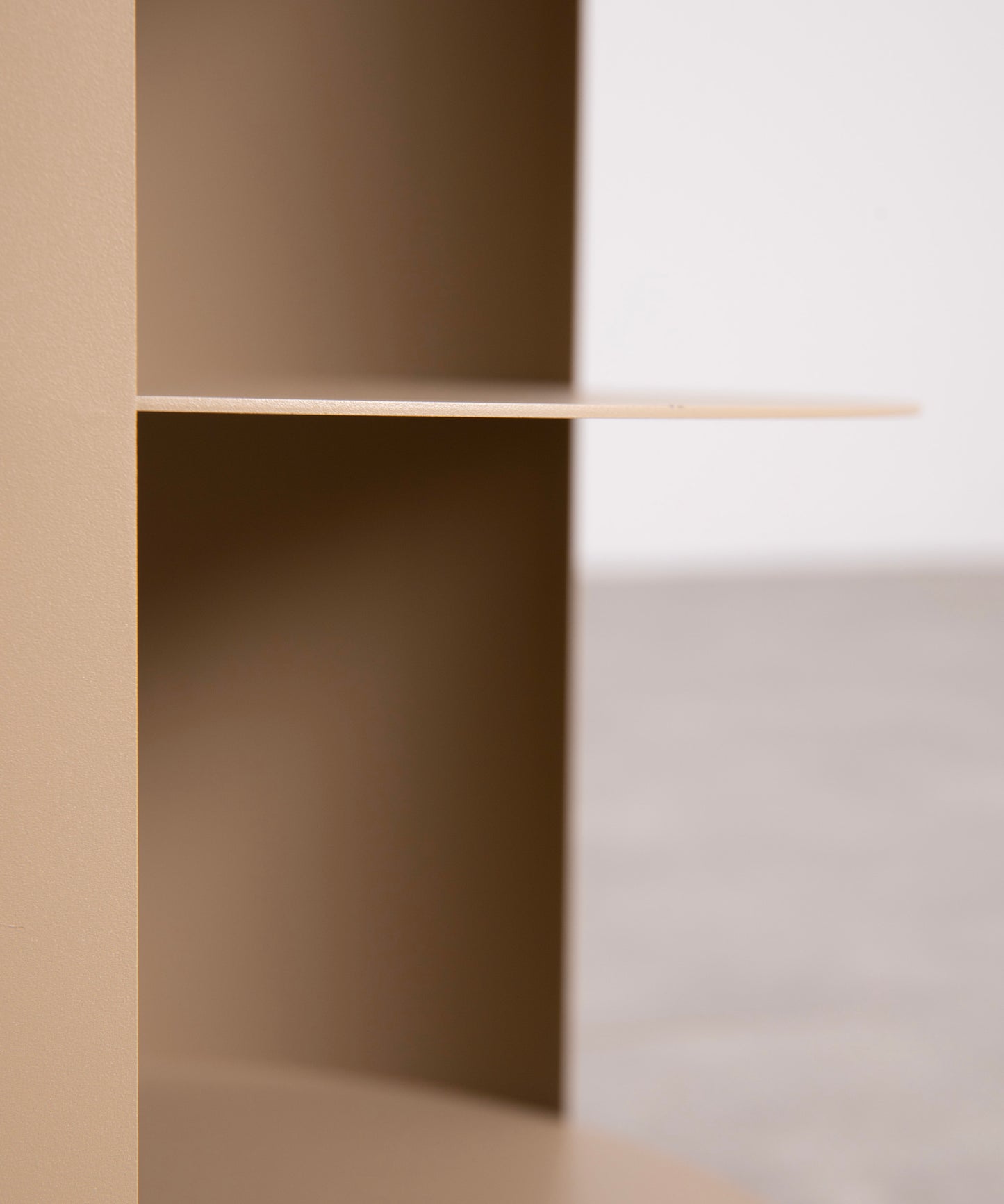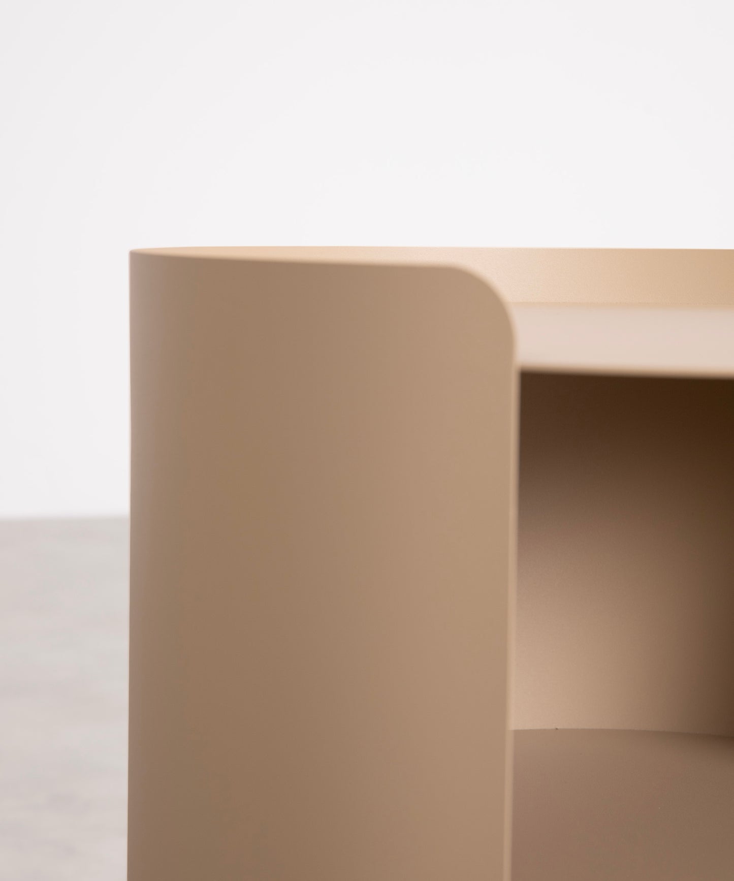 Esta pieza está fabricada en metal de alta calidad. Está formada por líneas curvas y su práctica repisa inferior, perfecta para colocar libros o cualquier otro objeto.