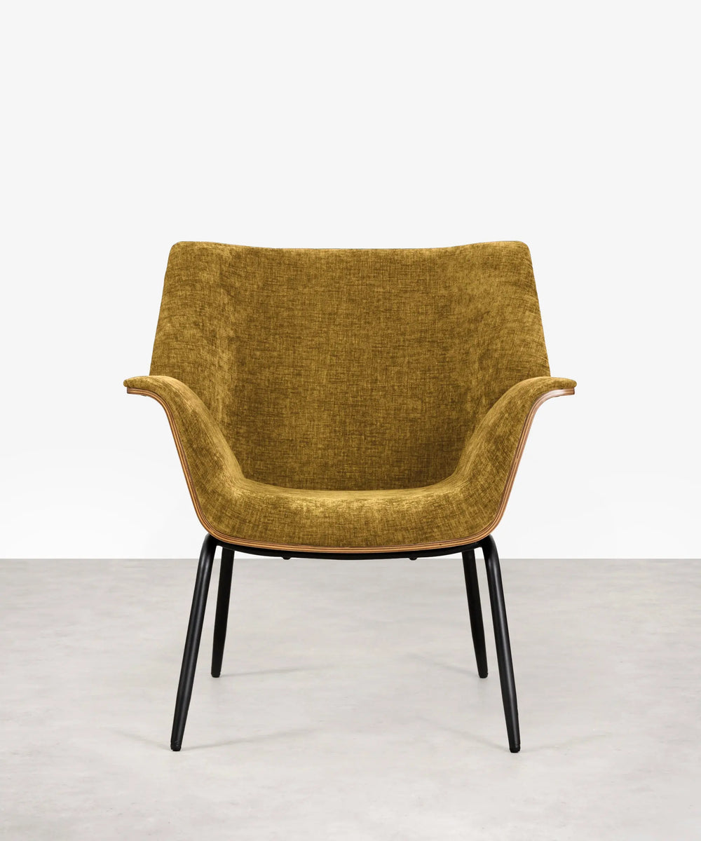 El sillón Romi tiene un diseño retro que destaca por sus líneas limpias y una estructura robusta en madera de nogal y acero negro. El respaldo y los apoyabrazos están suavemente curvados, brindando una experiencia de confort excepcional.