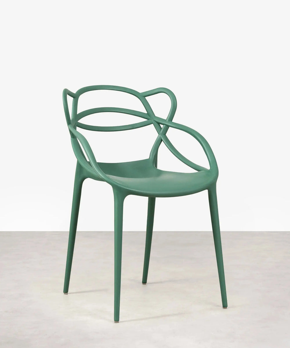 Disponible en varios colores. El respaldo de la silla presenta líneas curvas que se entrecruzan, creando áreas vacías que añaden un toque distintivo al diseño. Los reposabrazos se extienden sutilmente hacia el frente, en perfecta armonía con el resto del conjunto.