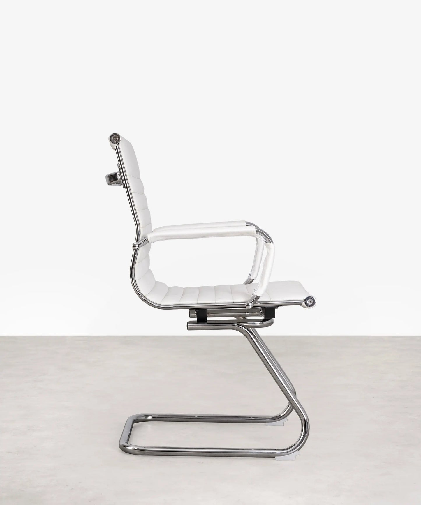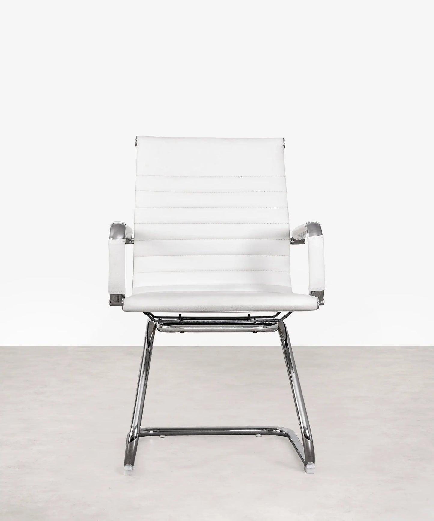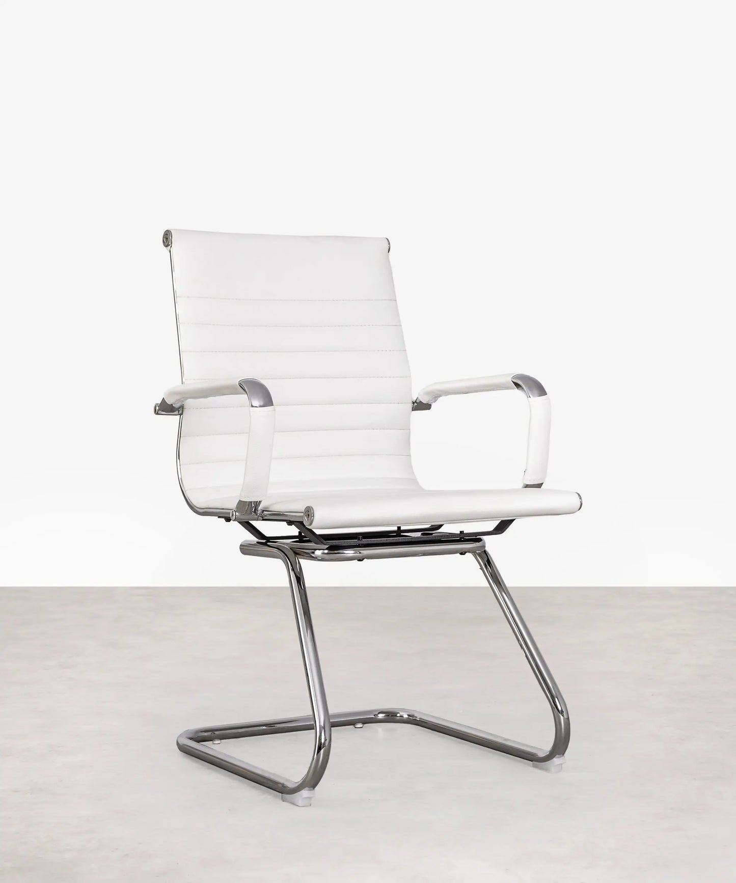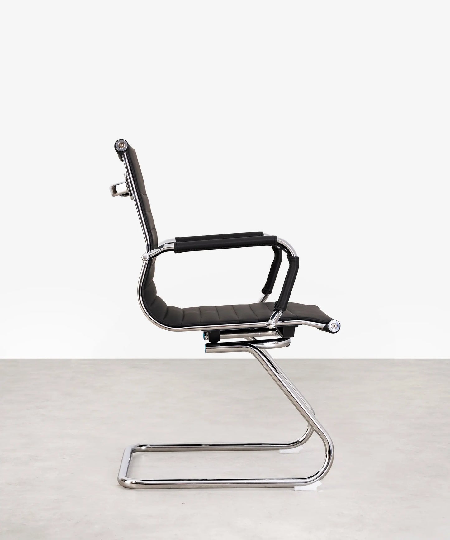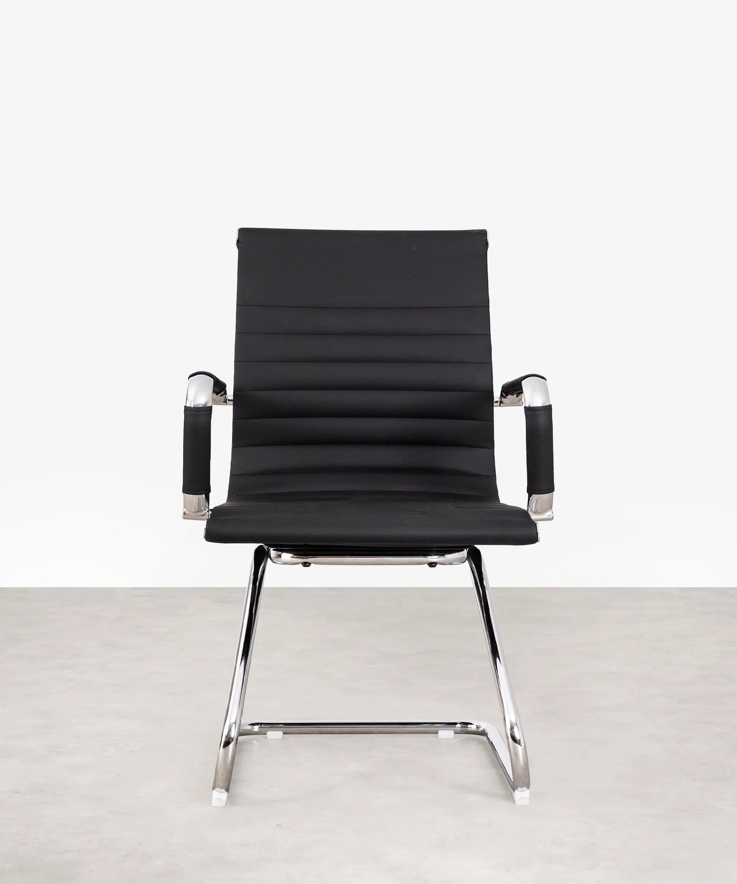 Esta silla está formada por una base de aluminio cromado. Sus patas son fijas y de estilo trineo. El asiento y el respaldo están tapizados en piel sintética resistente y de máxima calidad.