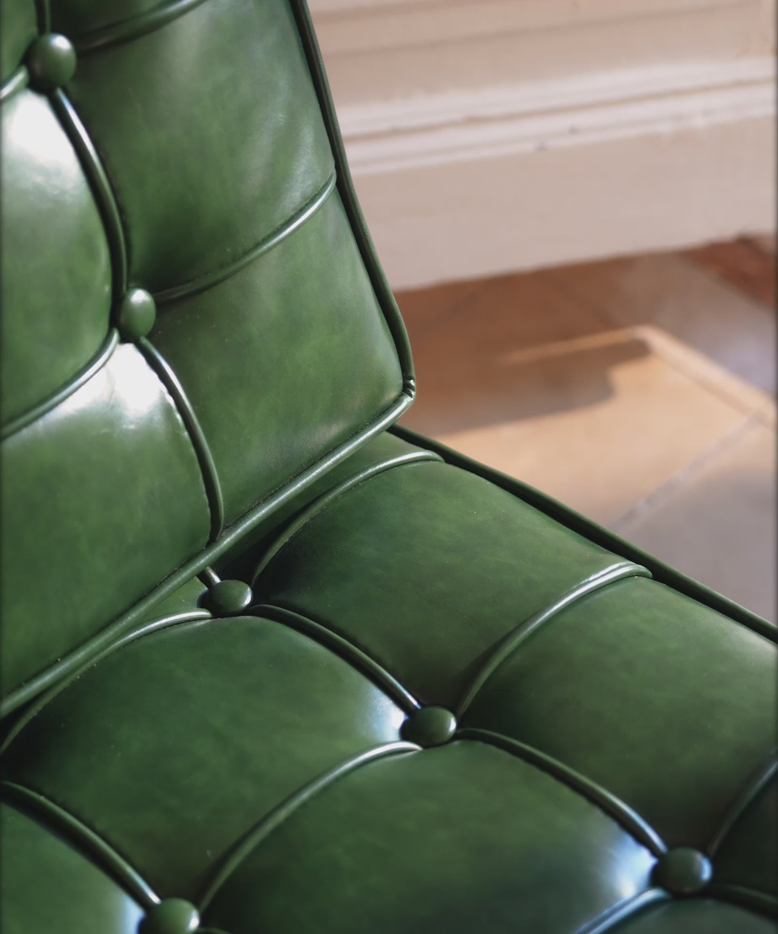 La tapicería es polipiel resistente de máxima calidad. Los botones están cosidos a mano con la técnica original.