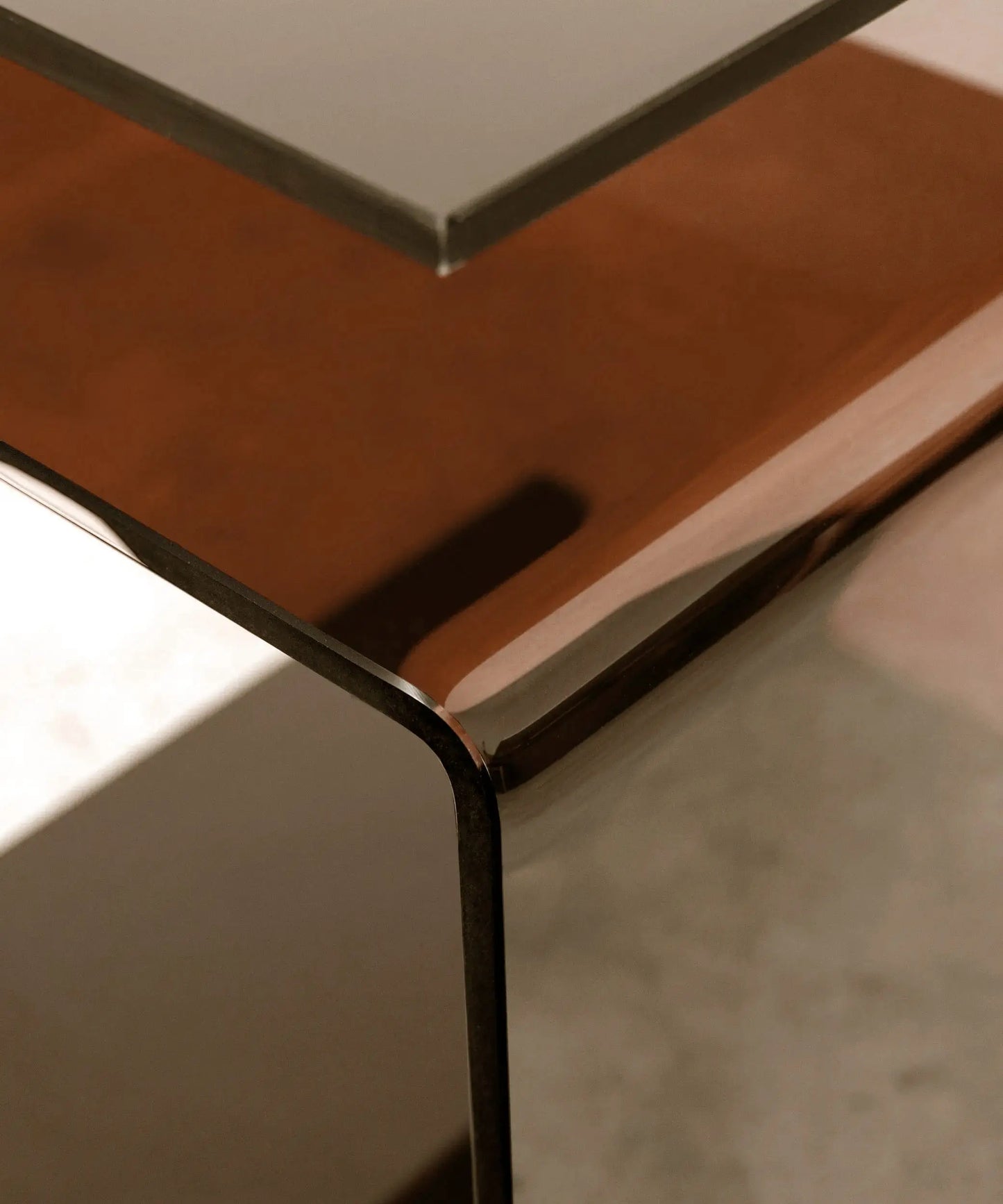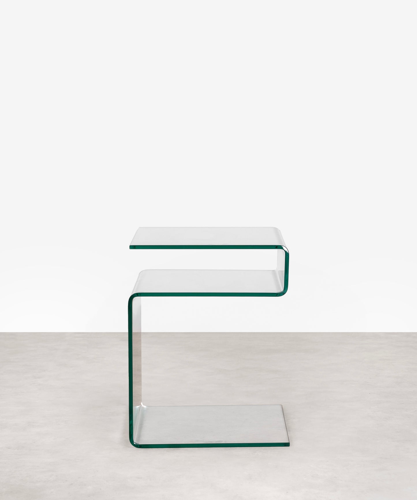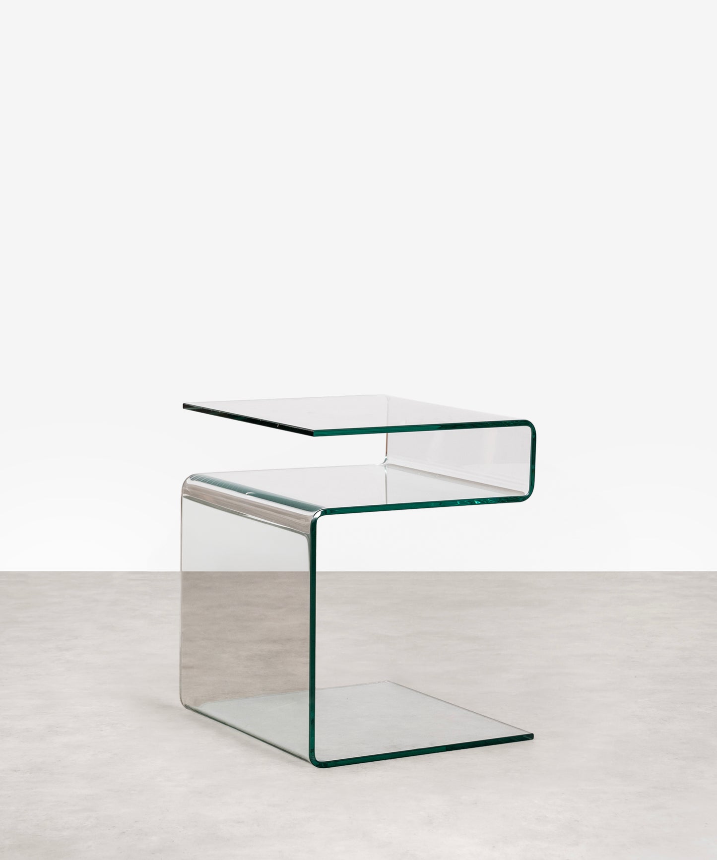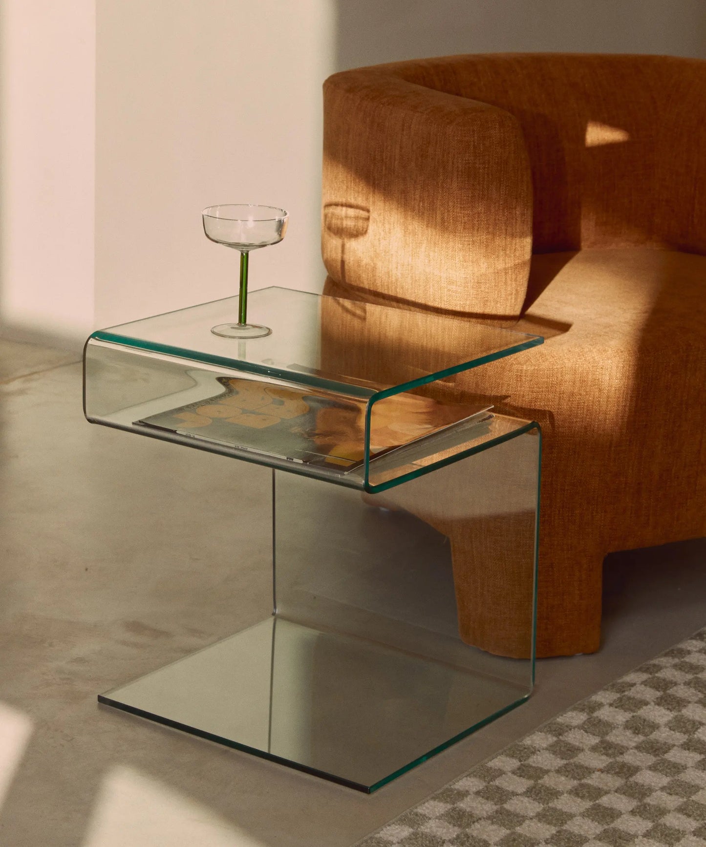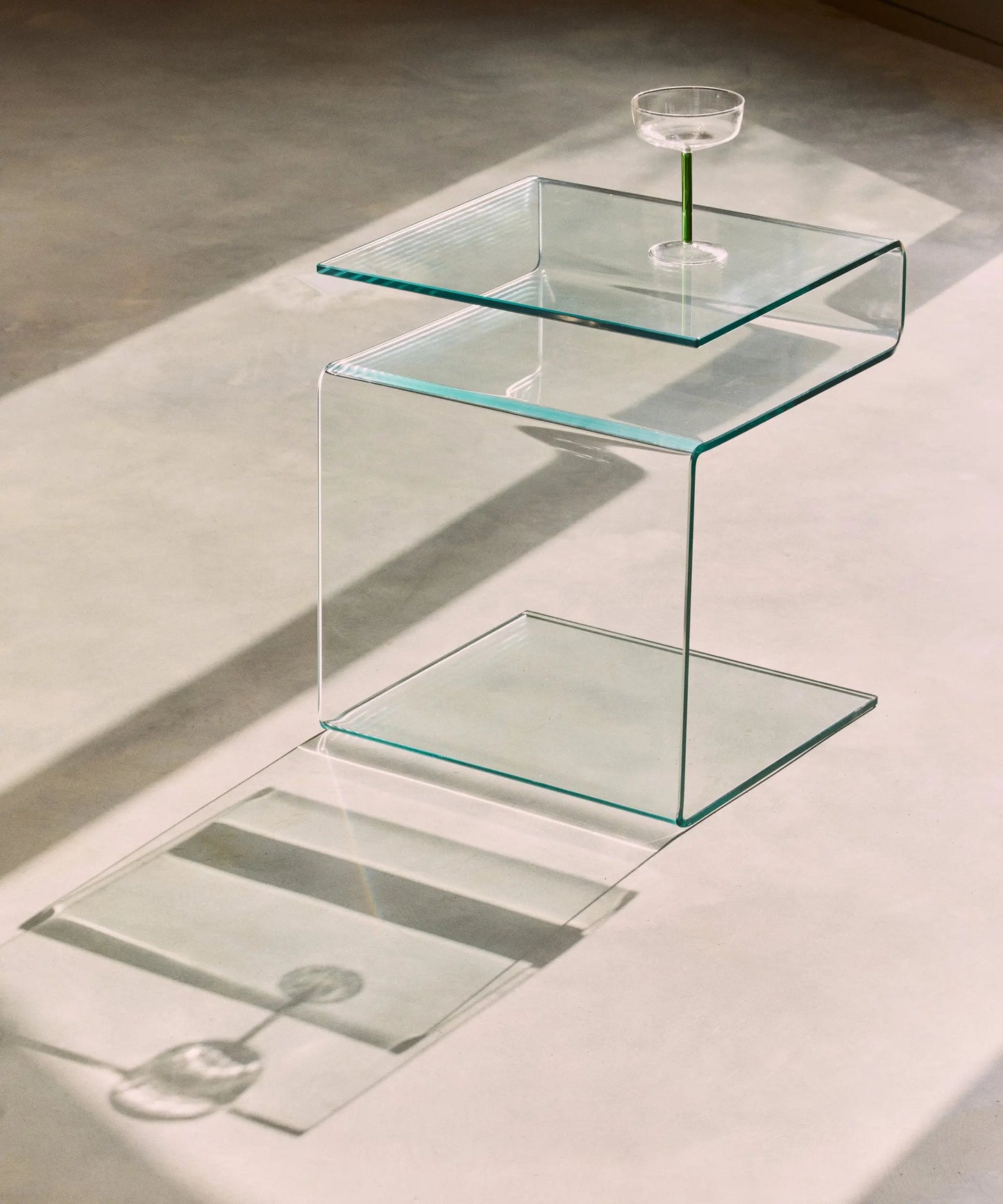 A nossa mesa auxiliar de vidro temperado Saura é uma peça única que combina elegância e originalidade no seu design. Fabricada com vidro comum temperado numa forma original de "S", esta mesa auxiliar é tanto uma afirmação de estilo como uma peça funcional em qualquer espaço.