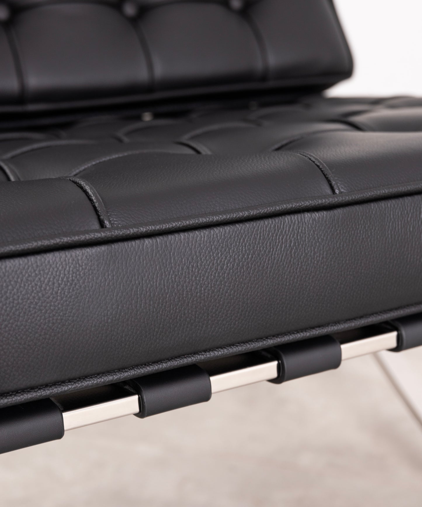 O estofamento é em pele sintética resistente de alta qualidade. Os botões são cosidos à mão com a técnica original.
