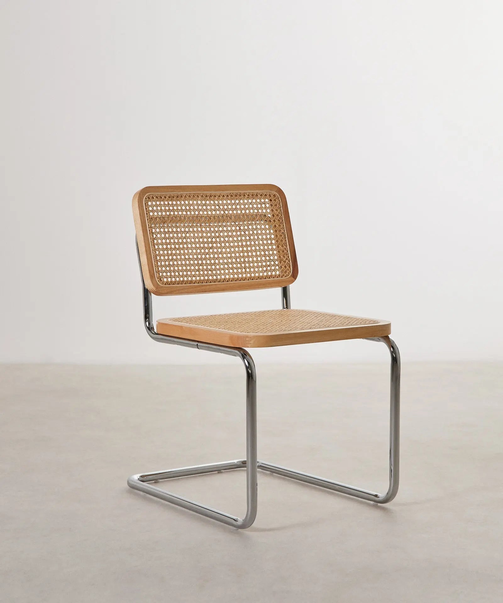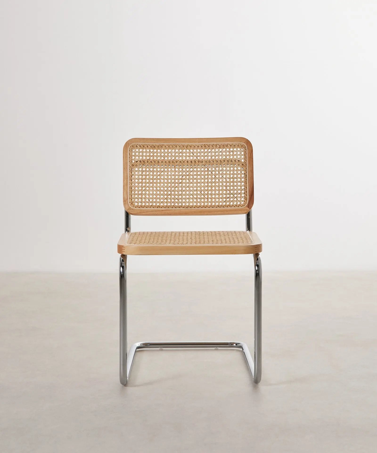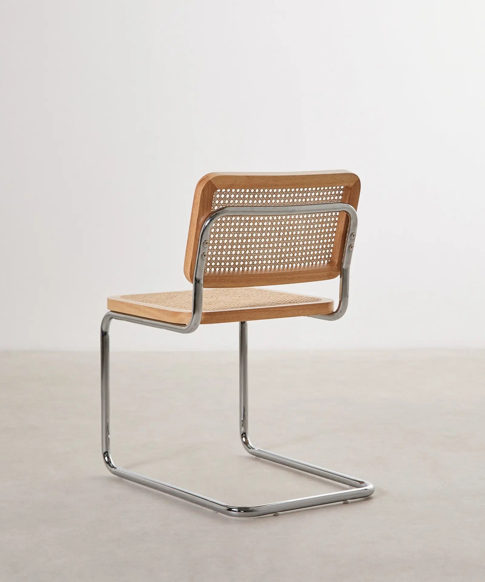 Traga um toque de vindima à sua casa com a nossa Cadeira de Jantar Candela. O seu encosto e assento em madeira e rotim natural contrastam perfeitamente com as sua estrutura em aço inoxidável.