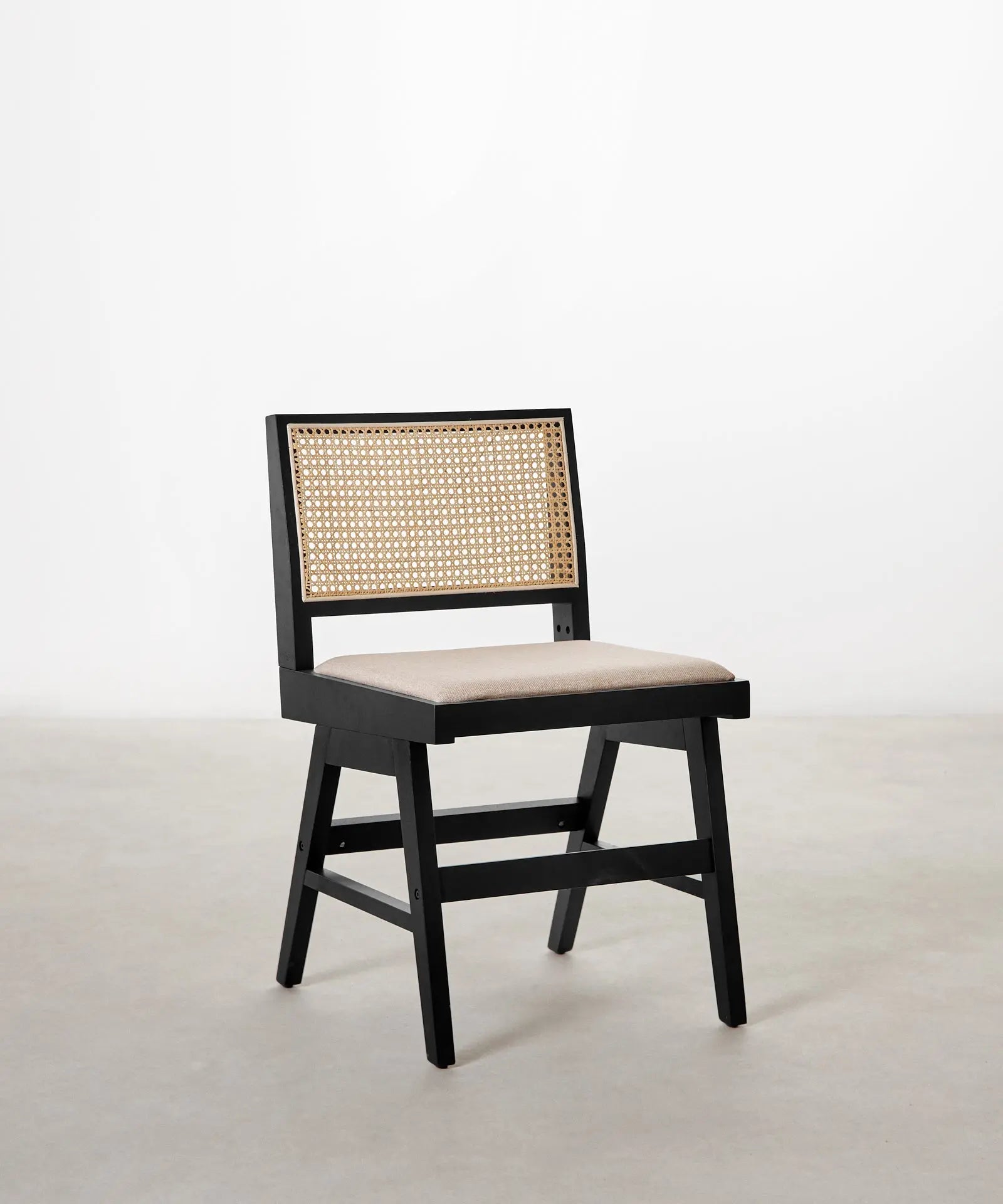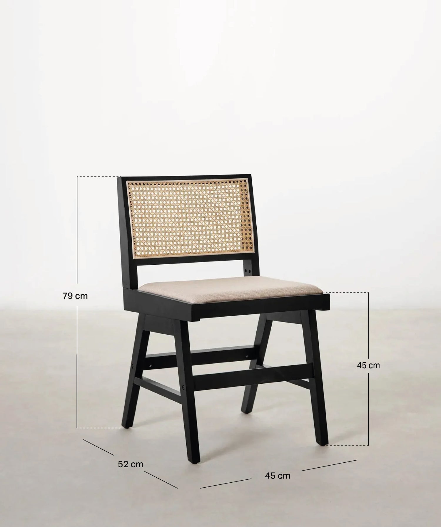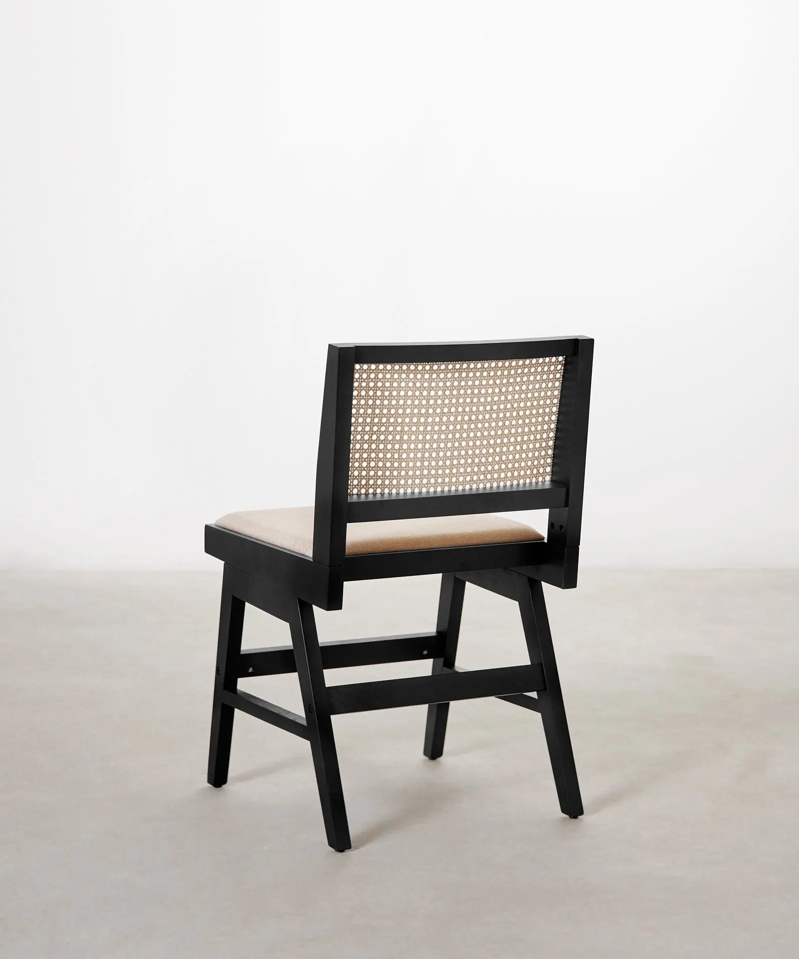 O encosto é feito de rattan natural, que oferece um toque artesanal e autêntico. O assento é estofado com um tecido macio, garantindo conforto e durabilidade.
