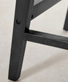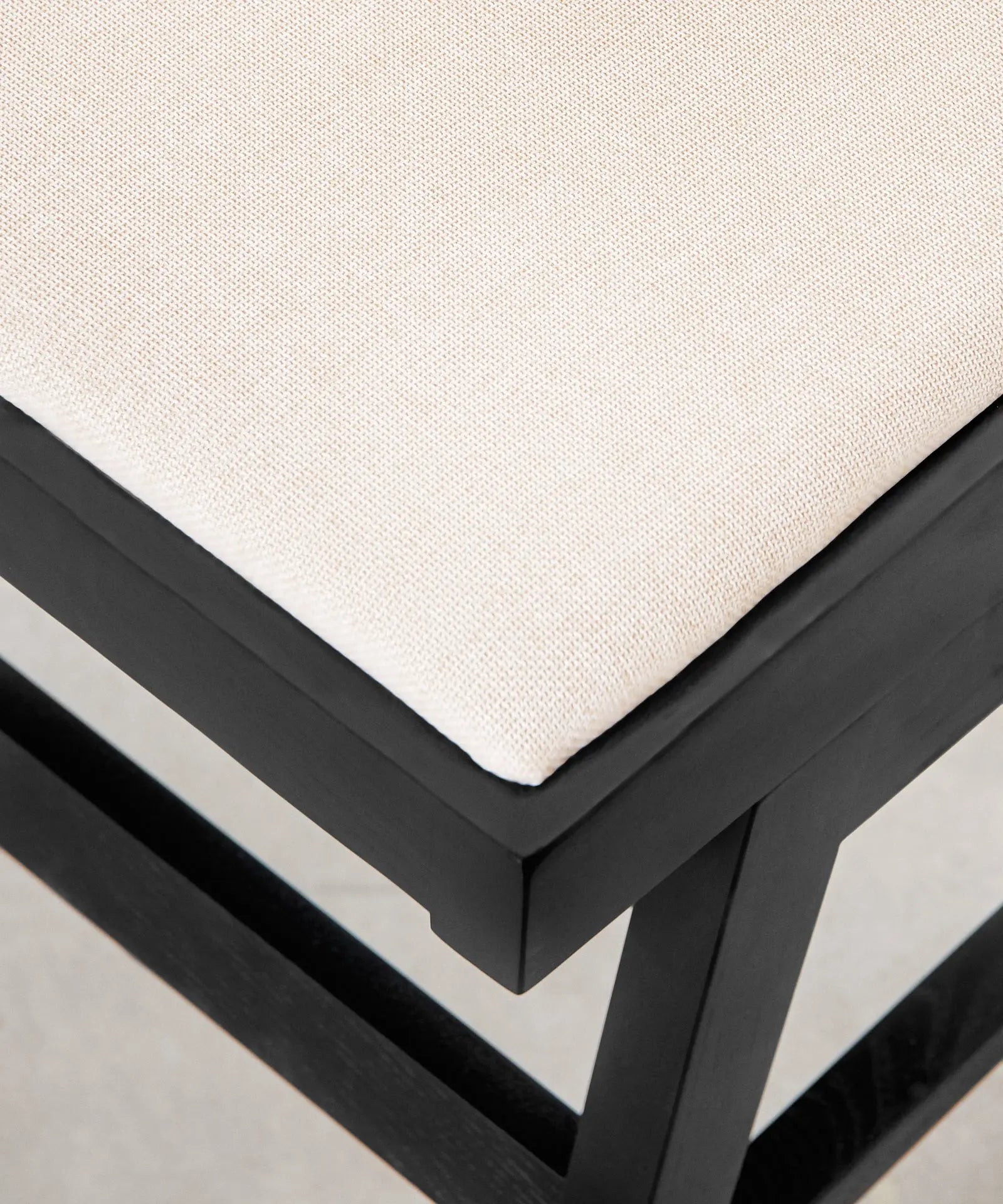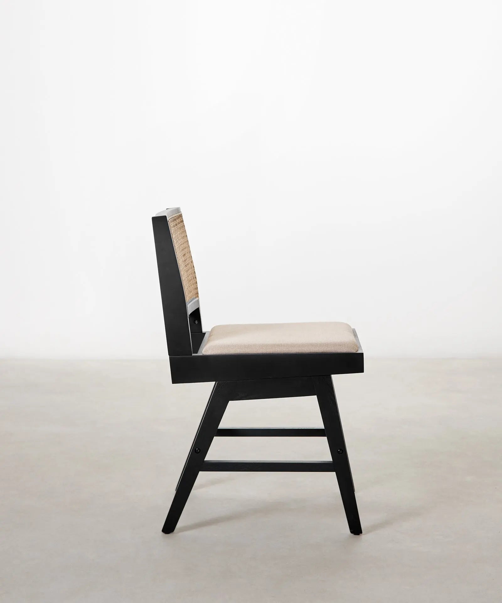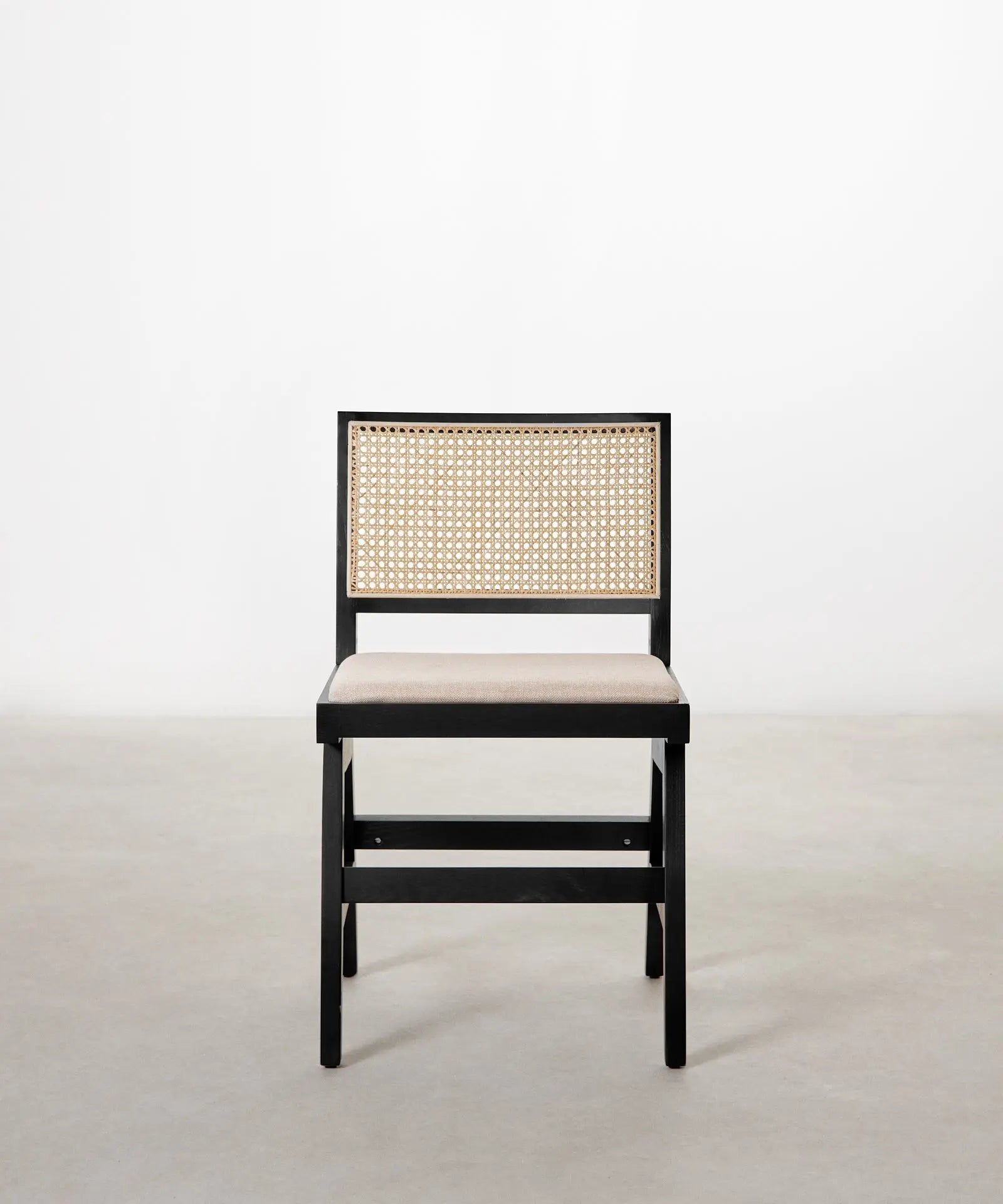 O encosto é feito de rattan natural, que oferece um toque artesanal e autêntico. O assento é estofado com um tecido macio, garantindo conforto e durabilidade.
