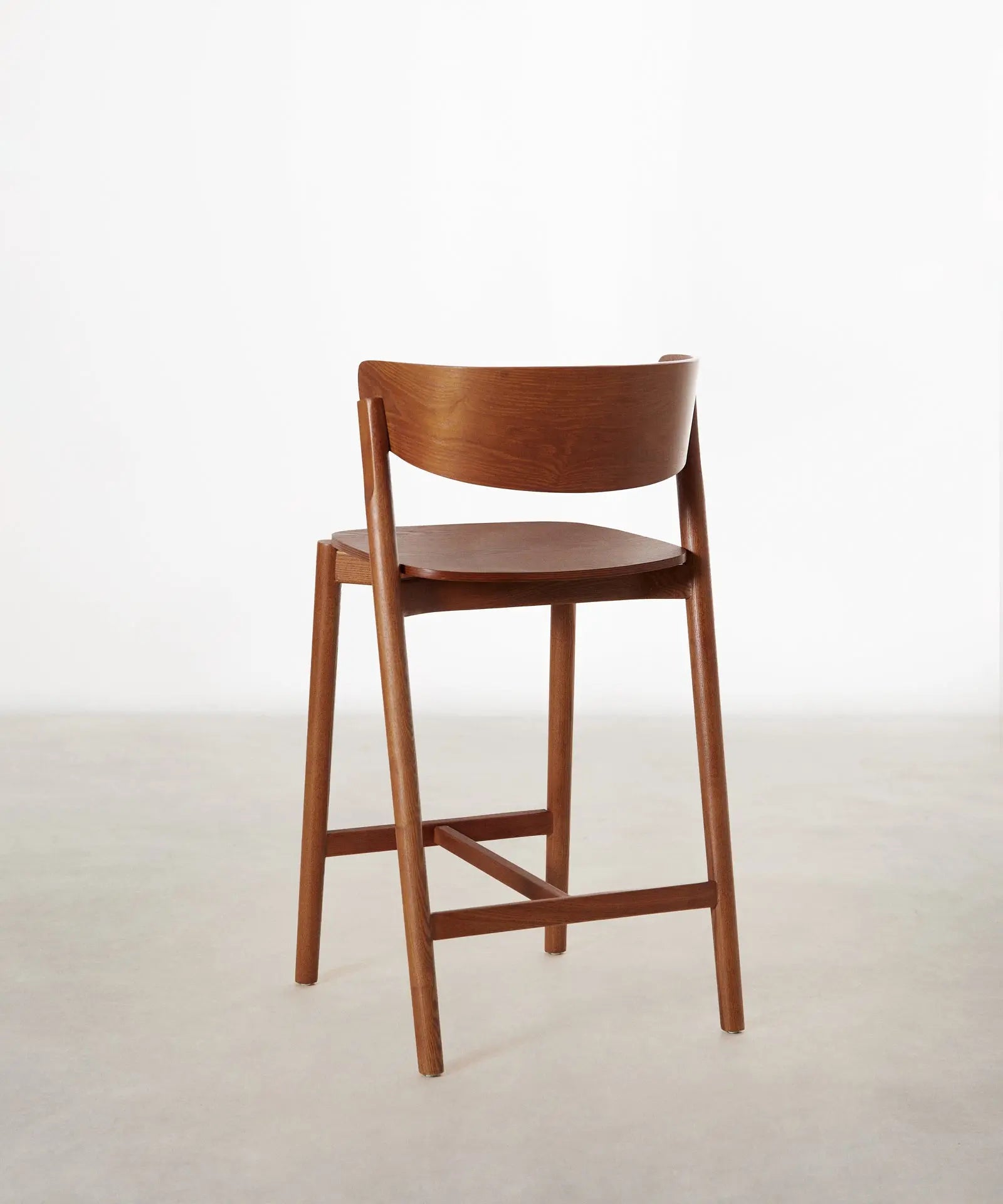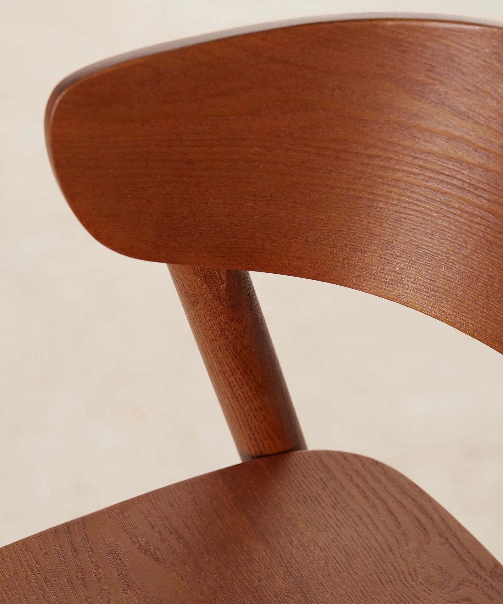 O encosto curvo e levemente inclinado oferece suporte ergonómico e confortável, ideal para longas refeições ou encontros informais. O assento largo e plano reforça a estabilidade e o conforto.